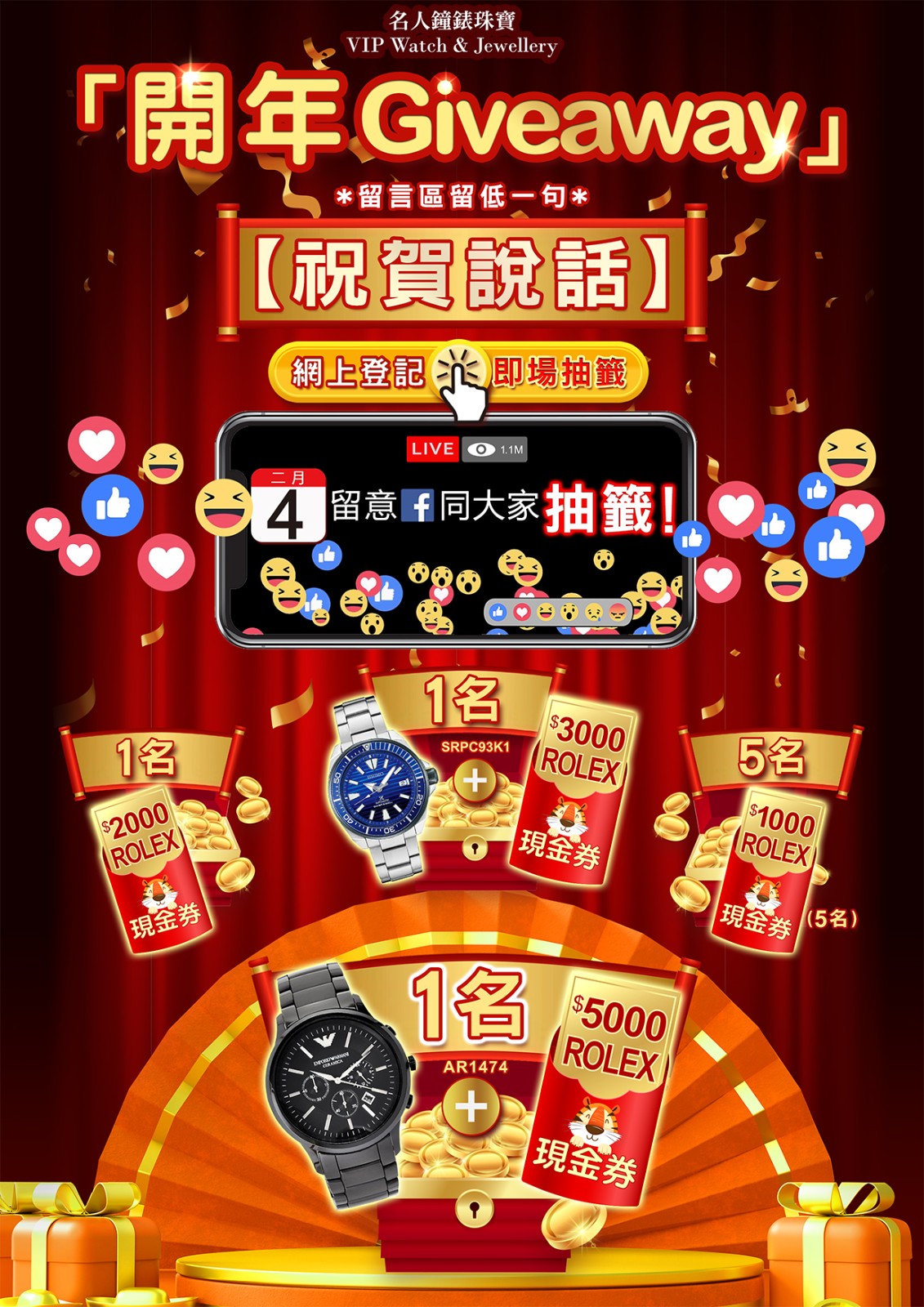 2022年2月4號下午6時30分,於 VIP Watch & Jewellery 名人鐘錶珠寶專頁的facebook live即時抽取中籤者,屆時會有專人聯絡中籤者領獎事宜。