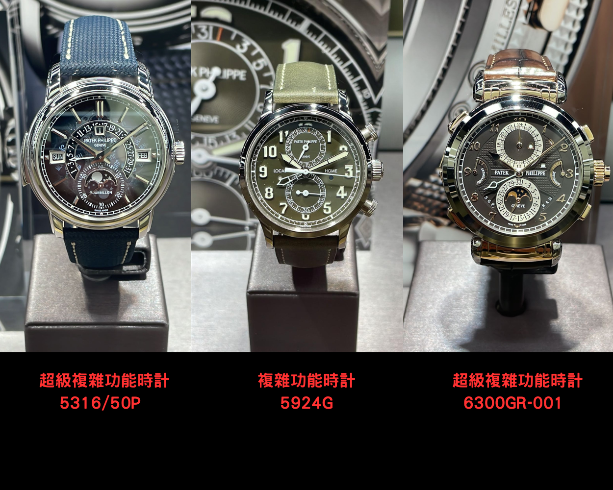 由左至右分別是超級複雜功能時計的5316/50P、複雜功能時計5924G和另一款同樣是超級複雜功能時計的6300GR-001。