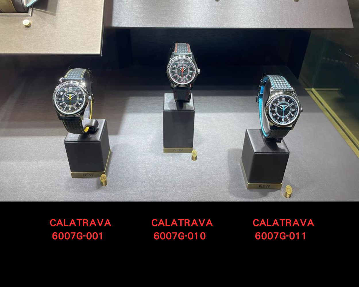 照片中均是是次發佈會Calatrava的新作,6007G-001、6007G-10、 6007G-011,時尚化的造型相信會吸引不少年輕一代的眼光。配有三種顏色的幾何圖案,紅、黃、藍襯托碳纤维圖案的小牛皮錶帶。