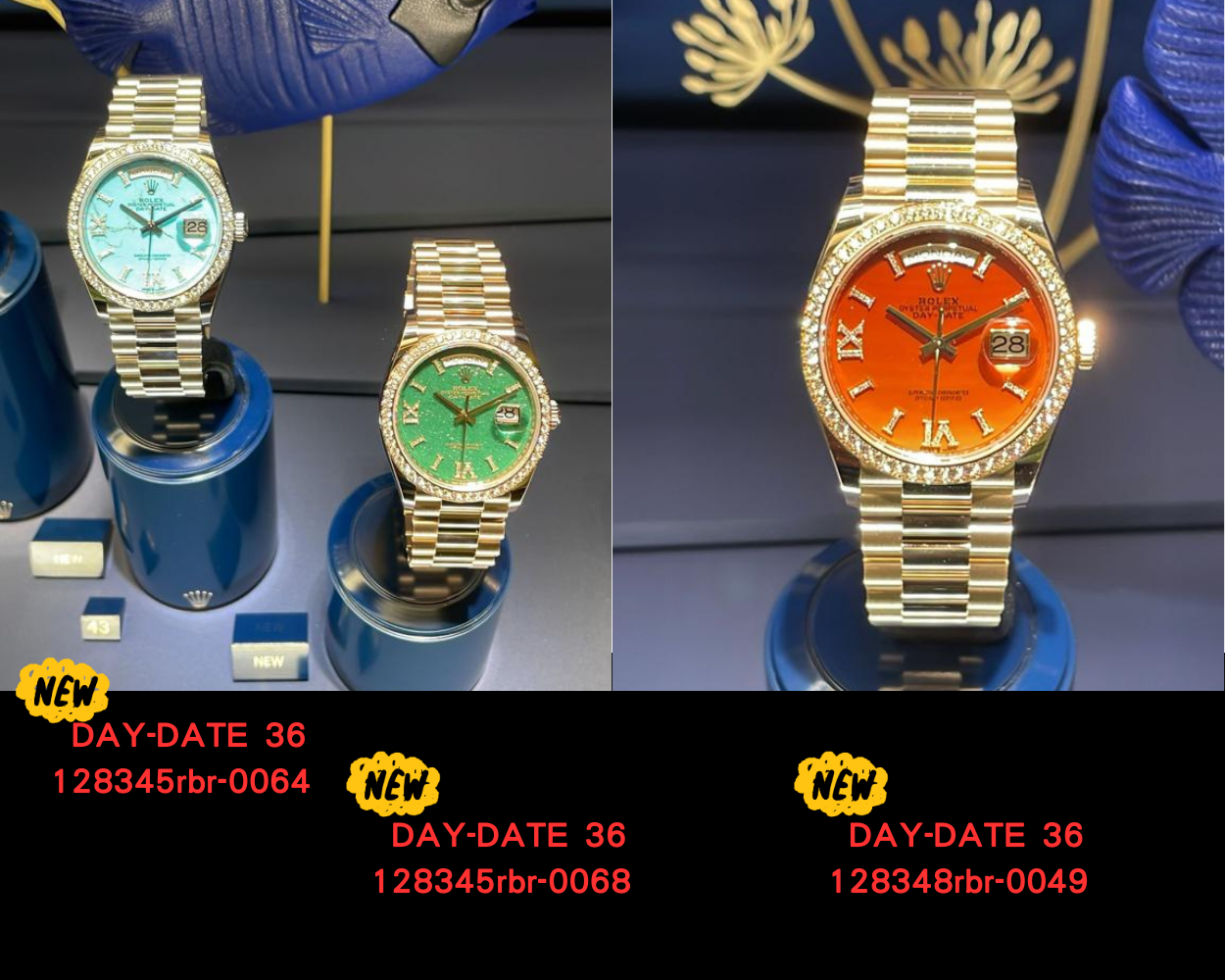 是次新款以綠色砂金石、紅玉髓及綠松石為主題,如果是以實物照片來看的話、仍然是Tiffany色的128345rbr-0064更勝一層; 但是以綠色砂金石為點畷的128345rbr-0068卻更能襯托總統錶稱號。話雖如此新款色紅玉髓的128348rbr-0049更是特別。