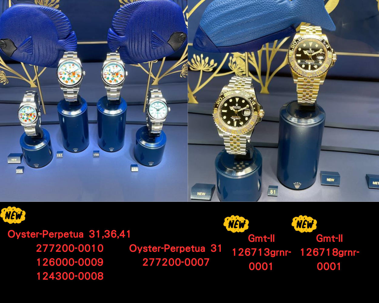 接著是Gmt-Master II,也是驚喜十足。全18K黃日與間金的造型時尚型格、Gmt-II家族也終於推出黃金色款。從左至右分別為: 126713grnr-001、126718grnr-0001。
