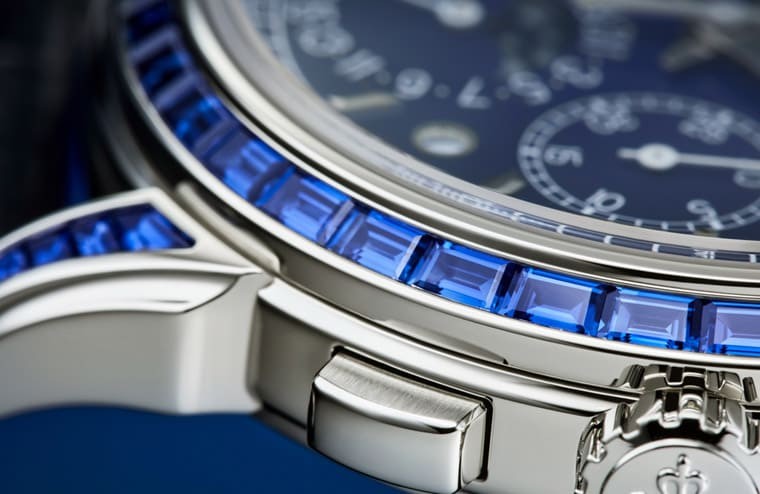 PATEK PHILLIPPE最新創作的Grandmaster Chime 6300高級珠寶版本同樣是以白金製作錶殼,其中一款一共鑲嵌了有409顆矩形切割鑽石,範圍遍及錶殼、錶圈、錶耳以及錶扣,另一款的錶殼、錶耳和錶圈鑲上了291顆矩形切割鑽石,另外在正面錶圈及錶扣鑲上了118顆矩形切割藍色藍寶石,品牌主要採用隱形的鑲嵌工藝,使得鑽石與寶石看來仿佛像是緊密相連、不依靠任何鑲爪固定,其實鑽石乃是透過錶圈內部的溝槽輔助,所以表面才看不到任何鑲爪,有助於更徹底釋放寶石與鑽石的光芒。