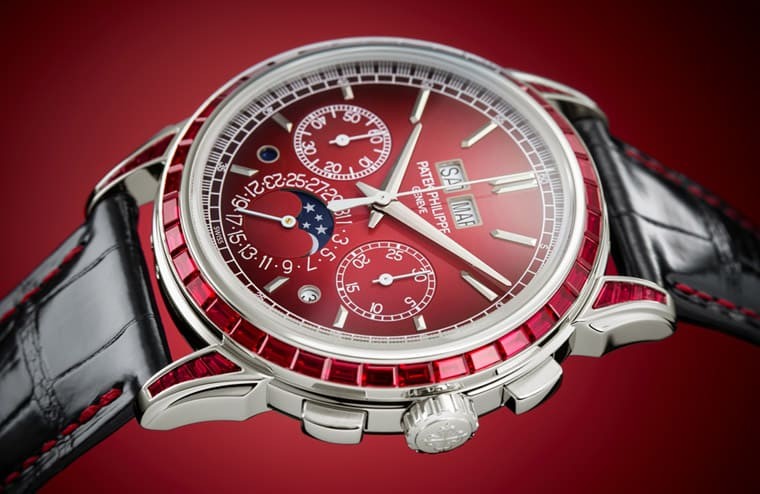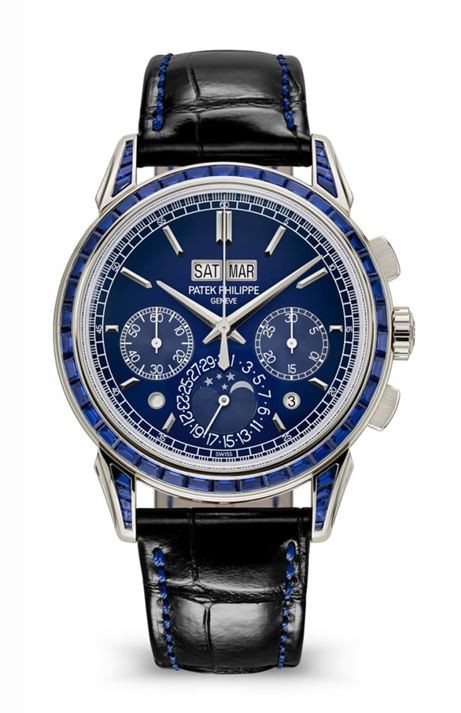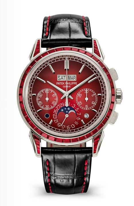 ▲另款高複雜的萬年曆計時碼錶5271也新添珠寶版本,百達翡麗以藍寶石或紅寶石點綴錶殼外觀。