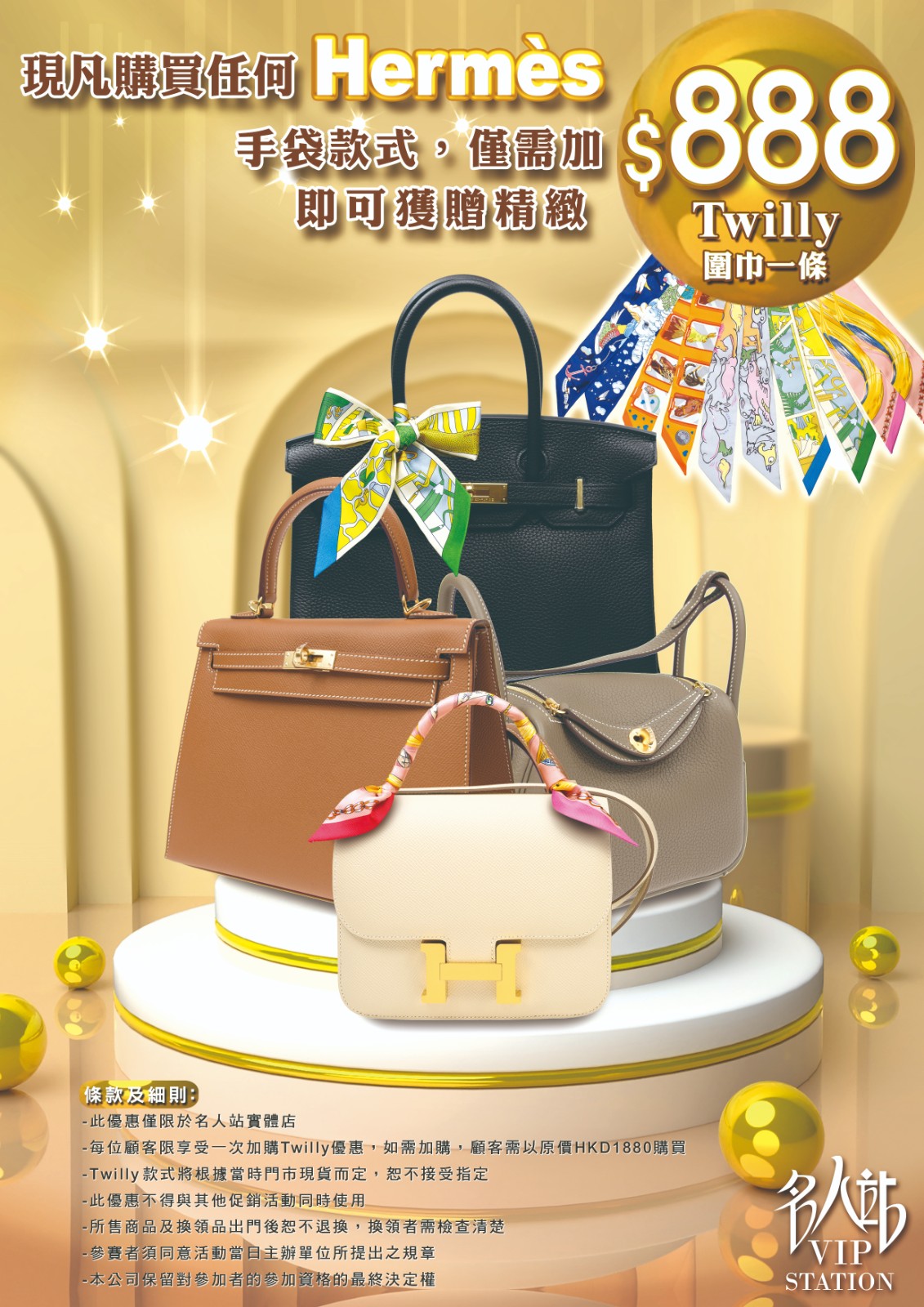 春日綻放,時尚新潮流! 我們隆重推出春季促銷活動,讓您在換季之際,也能更新您的時尚配件。現在,當您選購任何一款Hermès皮製手袋(不包化妝袋),只需加$888,便可換購一條精緻的TWILLY絲巾。