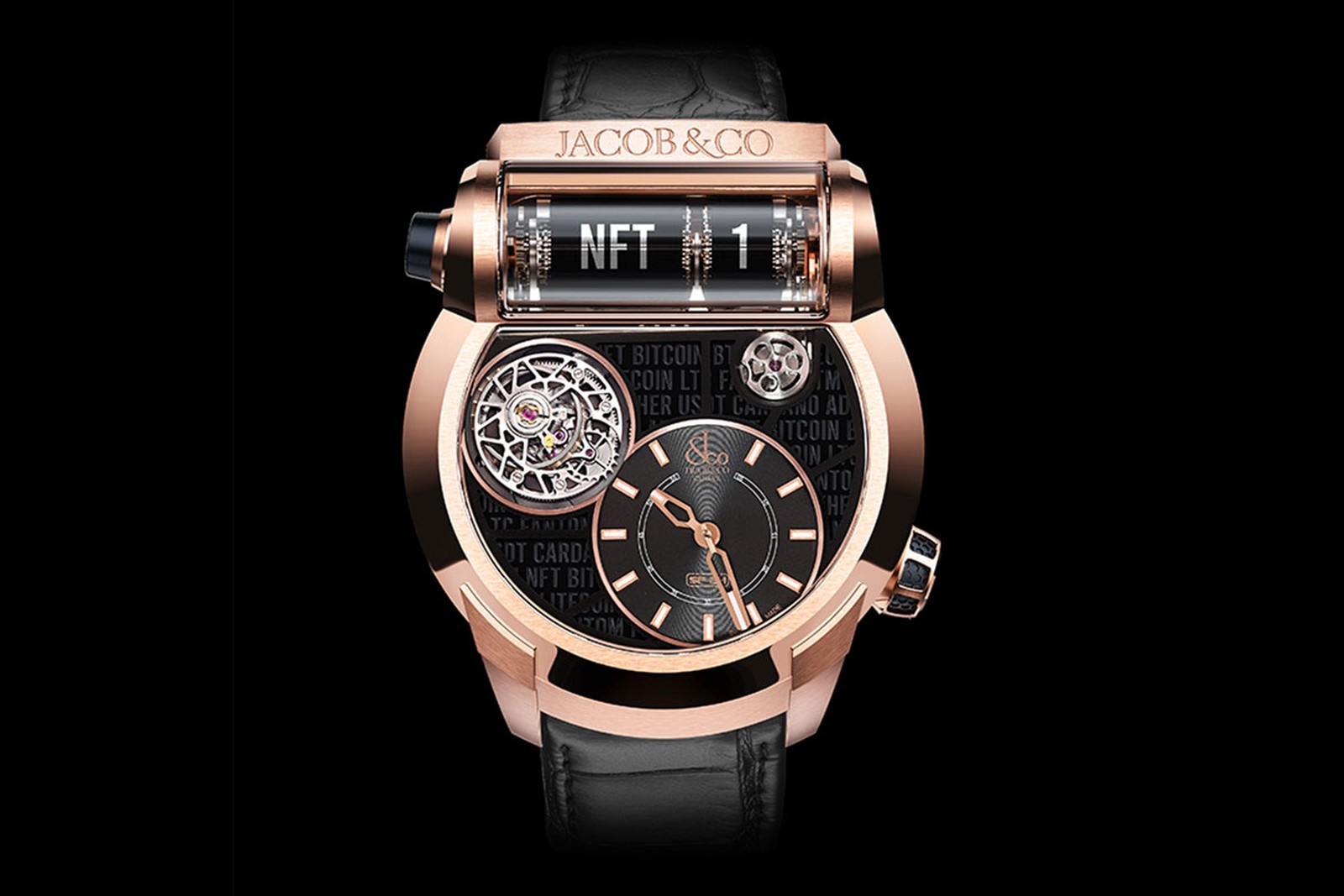 在2021年由Jacob&Co在 4 月 4 日時宣布與 NFT 平台 Artgrails 合作推出的「 NFT SF24 Tourbillon」腕錶,這支虛擬手錶有著吸引眼球的外型和俐落的線條,起標價為 1,000 美元,錶面還低調設計了各種加密貨幣的字樣(Bitcoin、Ethereum….),4 月 7 日起在 ArtGrails 上開放競標,及後以10萬美元成交。