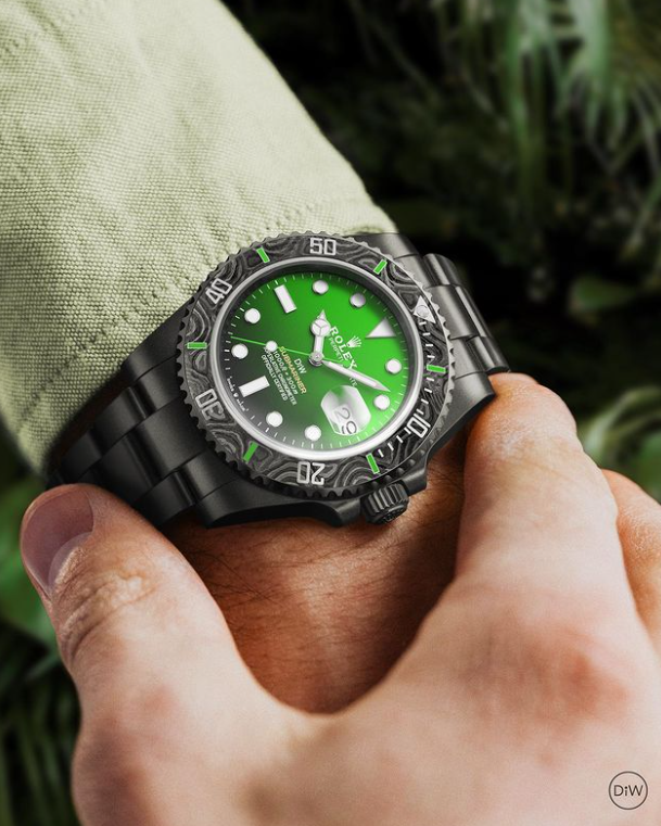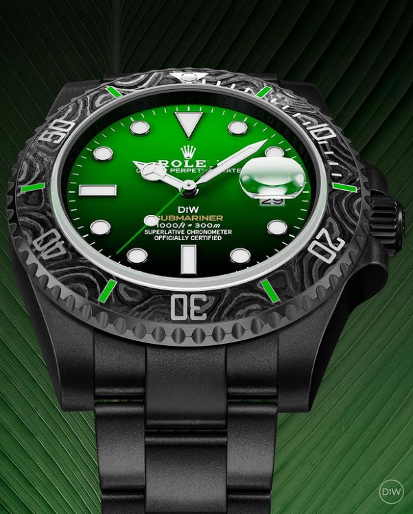 比利時改裝手錶品牌Designa Individual(DiW)最近熱衷於設計漸變層面盤,他們才剛發佈了一款用碳纖維和橙色漸變面盤的Submariner Persimmon,現在又新推出一款黑綠漸變的Submariner Parakeet。品牌這次把勞力士的代表色綠色和沉穩神秘的黑色結合在一起,把本來平淡無奇的綠水鬼賦予了全新生命。